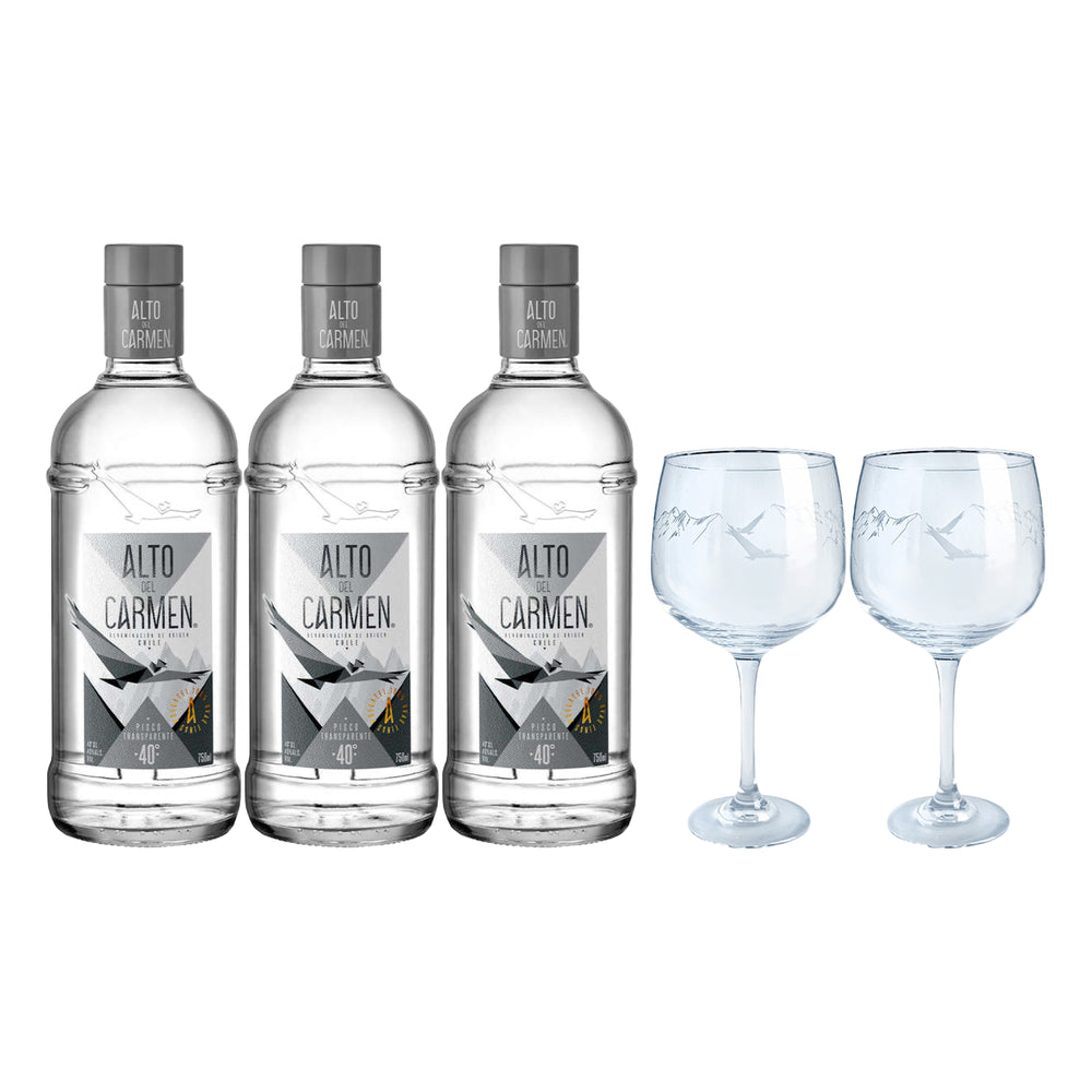 3x Pisco Alto Del Carmen Transparente 40º 750cc + 2 Copas Alto del Carmen de Regalo