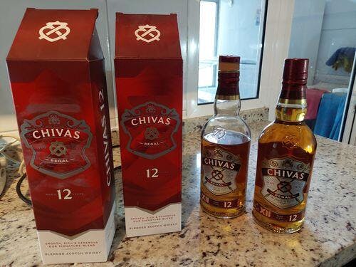 Chivas Regal 12 años Whisky Escocés, suave, rico y generoso, color ámbar cálido radiante, elaborado con whisky de malta y whisky de grano. Envejecido por al menos 12 años en barricas de roble. Con un sabor, redondo, cremoso a peras maduras, manzana roja, vainilla, avellanas y caramelo. Aromas a infusión aromática de hiervas silvestres, miel y frutos del huerto. Con un final rico y persistente