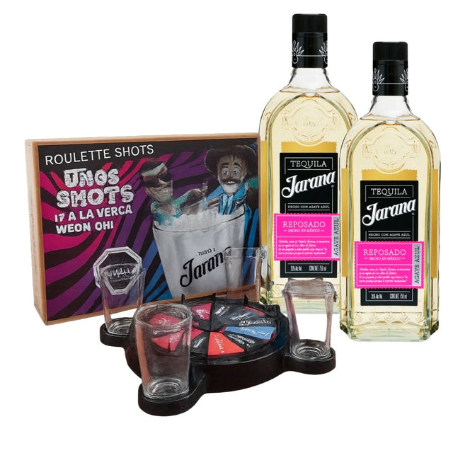 Disfruta de una experiencia premium con este pack que combina dos botellas de Tequila Jarana Reposado 35°, un espíritu mexicano de carácter robusto y notas de caramelo y vainilla, acompañado del Juego Ruleta Shots para potenciar la diversión en tus reuniones. Ideal para coleccionar, compartir o regalar a los amantes de destilados de calidad que buscan elevar sus momentos sociales con estilo y entretenimiento.