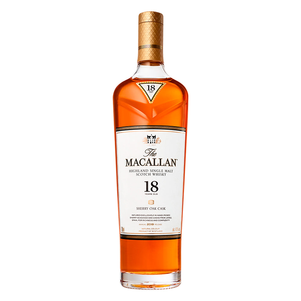 Whisky Macallan Sherry Oak 18 Años, una expresión excepcional madurada exclusivamente en barricas de jerez seleccionadas a mano durante 18 años. Presenta notas complejas de frutas maduras, jengibre, canela y madera, con un final elegante y persistente. Un single malt escocés de prestigio internacional que refleja la maestría destiladora de The Macallan en formato de 700cc.